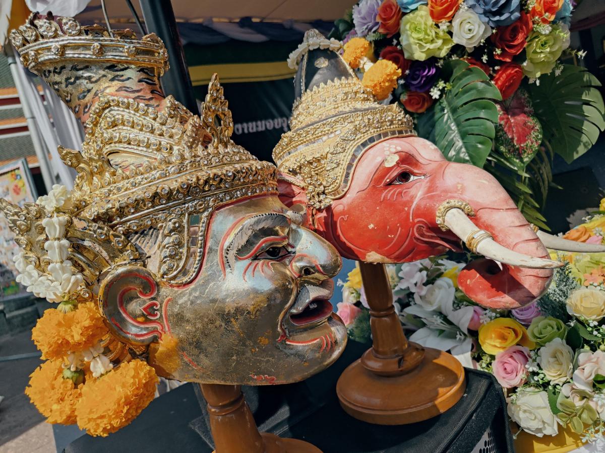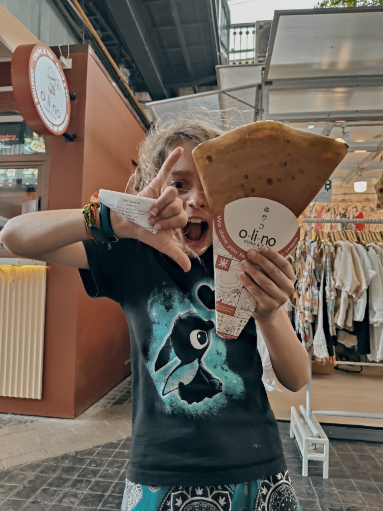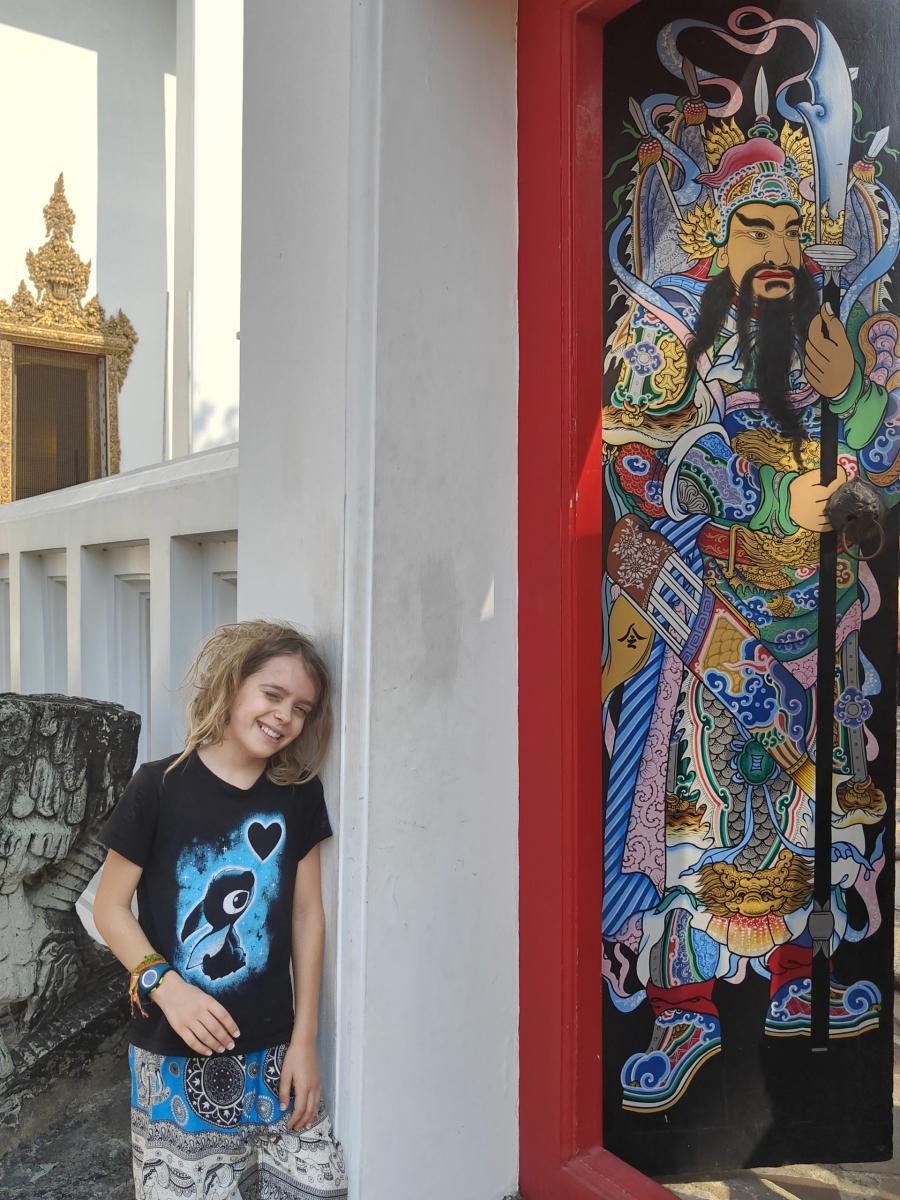 Aprés ces deux visites on déambule dans la rue aux amulettes (je n’ai pas pris de photos), on fait une pause repas, crêpe au chocolat pour Gawën (oui ce n’est pas très thaï, mais Gawën n’est pas trop fan de la nourriture thaï) et on trouve un resto avec des plats végétariens (youpi!)