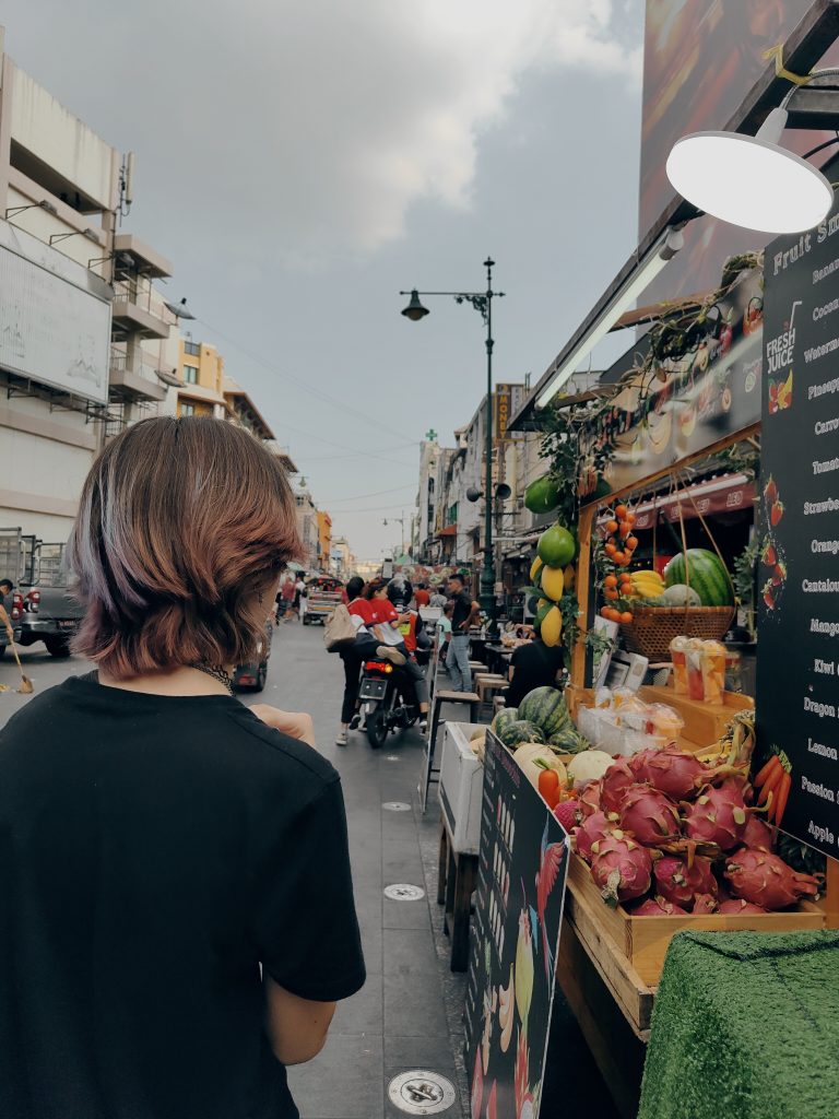 On mange un petit truc vite fait… Ce n’est pas en Thaïlande que l’on va faire une diète ! Ici on trouve à manger et à boire à toutes heures… les Thailandais n’ont pas vraiment d’heures de repas… Bon on galère un peu plus les végétariens, notamment pour la street food où il y a beaucoup de viandes et de poissons en grillades (aussi des insectes)… Et même pour les plats, où il y a pas mal de bouts de viande, poissons un peu partout… Bon on arrive quand même à trouver du tofu qui remplace la viande… Enfin c’est ce qu’ils nous disent 🤣