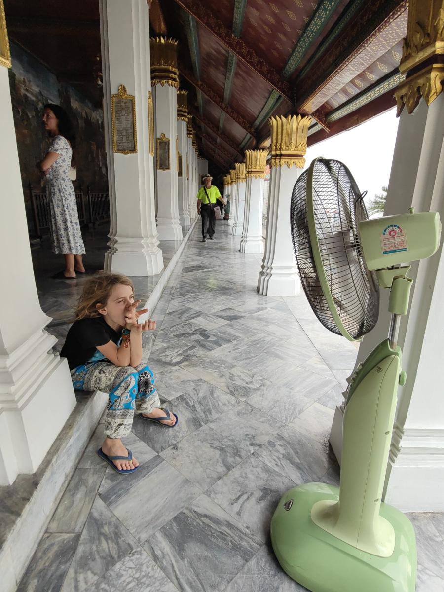 On rentre dans le temple, les enfants avec leur petit pantalon éléphants sur eux, moi je mets les jambes de mon pantalon et Cédric tente le pantacourt sous les genoux et nous avons tous les épaules couvertes.